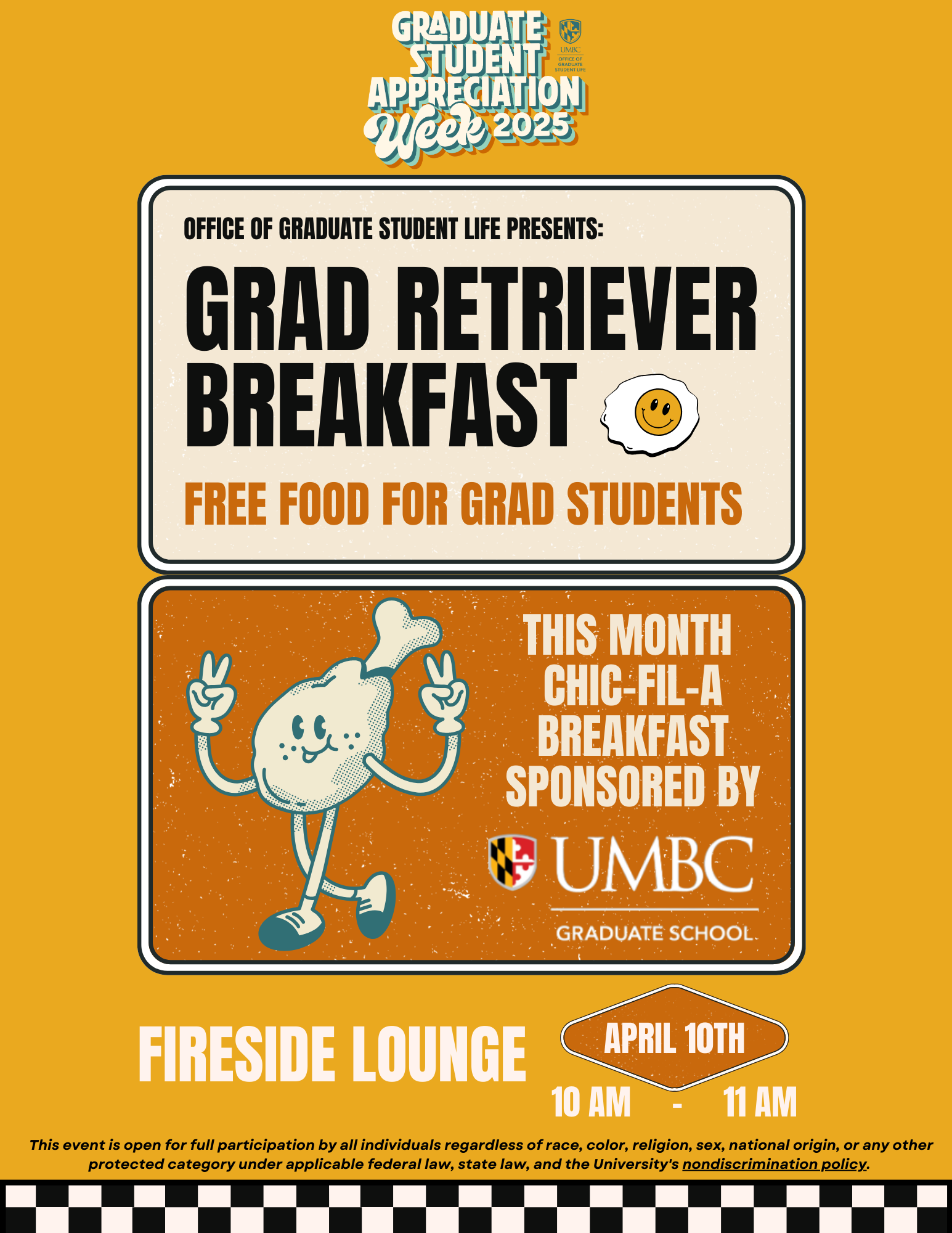 Graduate students, start your day off right! Enjoy FREE breakfast and coffee with your fellow Grad Retrievers next week. Join us for good food and good company, you'll also have a chance to meet with your graduate school leadership! This month's Chic-fil-a breakfast is sponsored by The Graduate School. Food Available While Supplies Last.
