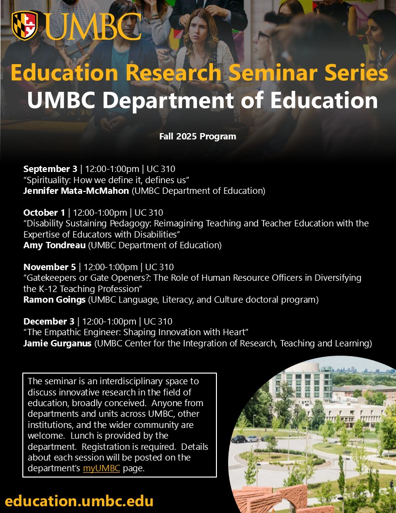 The UMBC Department of Education Research Seminar continues in October with a presentation by Dr. Amy Tondreau. Drawing on three interrelated studies, Dr. Tondreau will explore what it means to treat disability as a cultural identity worthy of sustaining and how we can develop disability cultural competence in our classrooms. She will share examples of how disabled educators leverage their expertise and understanding of the social, cultural, and medical aspects of disability in non-stigmatizing, humanizing teaching practices that can inform all teachers and teacher educators.