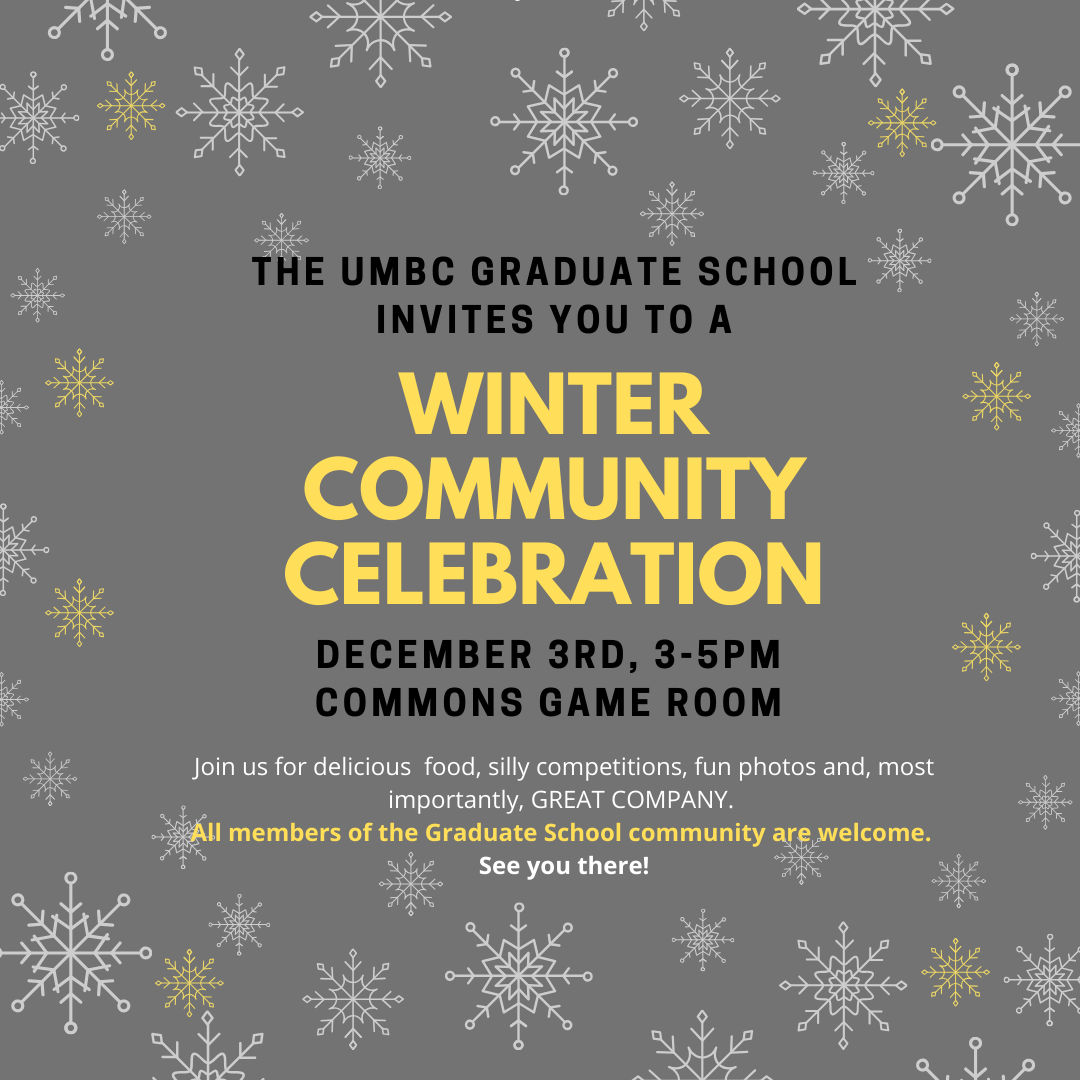 The Graduate School is hosting a Winter Community Celebration for the entire graduate school community, including all graduate students, postdocs, faculty, and staff at UMBC. We would love to see you there. This will be the perfect opportunity to network with students outside of your department, faculty, and graduate school leaders and enjoy appetizers, games, and a warm cup of tea/coffee.