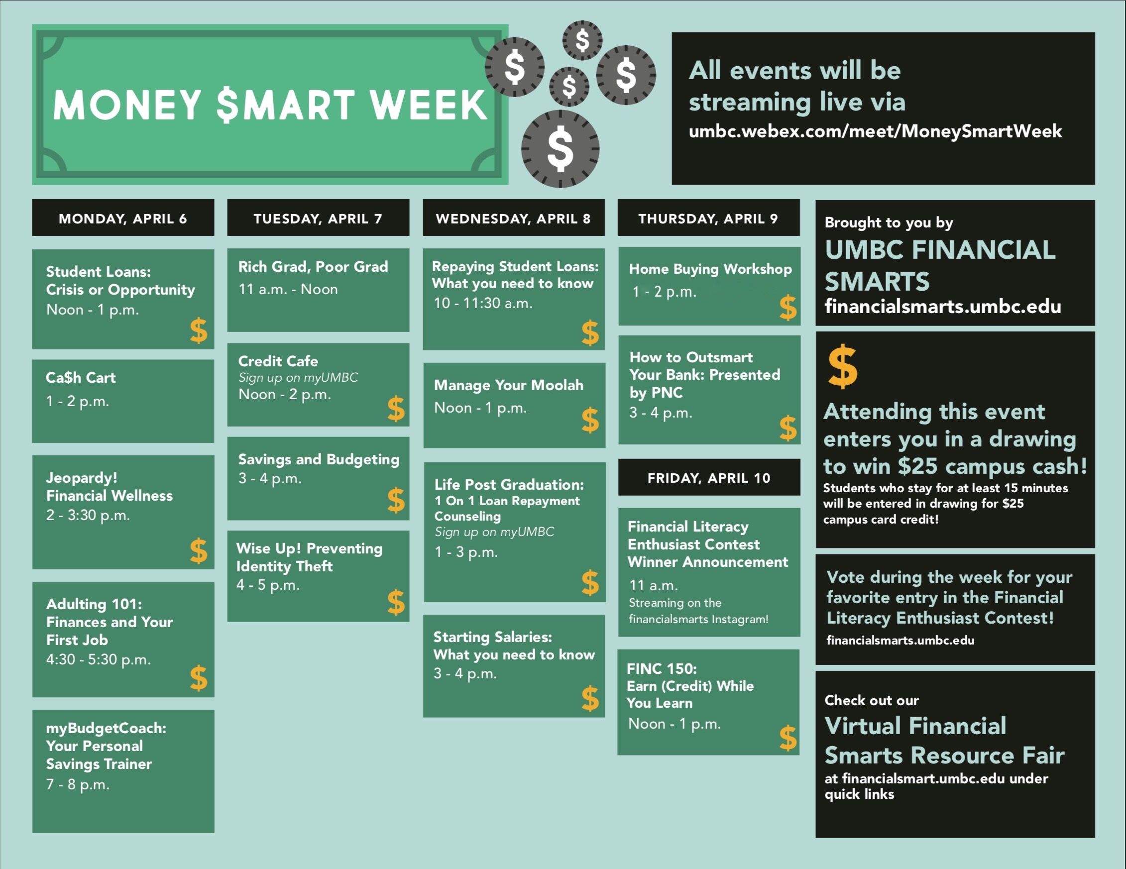 As part of Money Smart Week, we are co-hosting a session with PNC Bank on Home Buying. Not only will you learn the basics of home buying but you will also find out about specific programs that you may qualify for that will make home buying more affordable for you here in Maryland. Please join us on Thursday April 9th from 1-2pm at umbc.webex.com/meet/MoneySmartWeek. The other Money Smart Week Events can be found on their flyer.